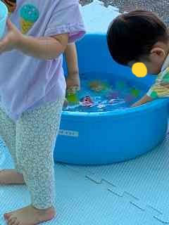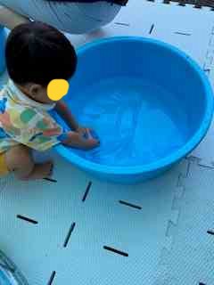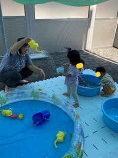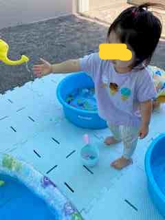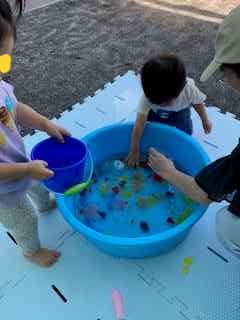今日は、タライに水を張り、ジョーロなどの玩具で水遊びを楽しんだり、水の中にある氷やカラフルな寒天粘土を触って感触遊びをしました。