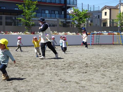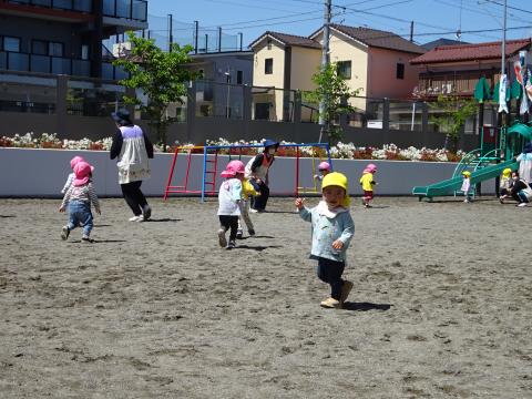 先生と追いかけっこを楽しんだり、砂場や遊具で遊んだりと元気いっぱいの園児達でした。