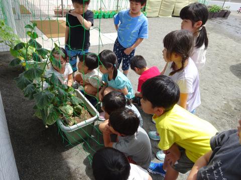 今回の収穫は、大きく育って立派なキュウリ。調理員さんに美味しく調理していただき、給食の時間にみんなでいただきました。