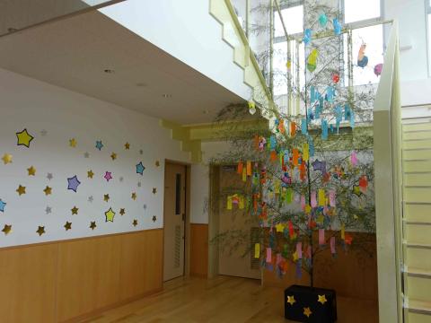 もうすぐ七夕。願いを込めた短冊を飾りと共に大きな笹につけました。