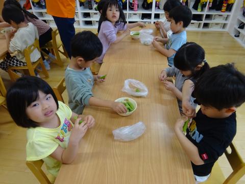すじをとるのは想像と違って難しいようで「かたい~!」「とれないよ」と悪戦苦闘している象組さんでしたが、コツを掴むと満足気に知らせていました。
